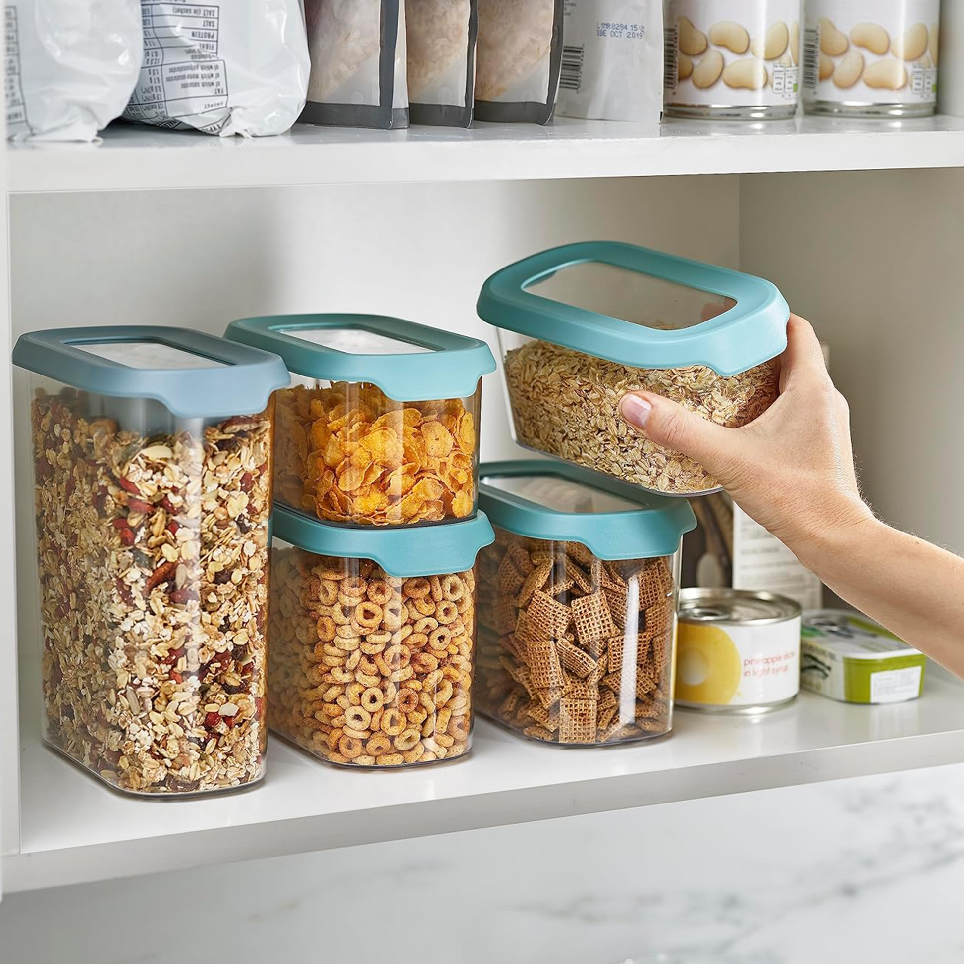 Organiza tu cocina con el juego de 5 contenedores de alimentos secos Aquila, vienen en una variedad de tamaños, para todas las necesidades de organización y almacenamiento de su cocina, ideales para almacenar alimentos secos que no requieran refrigeración como harina, azúcar, cereales, galletas, papas fritas, aperitivos, pasta, arroz, cereales, frutos secos, frijoles, café y té.