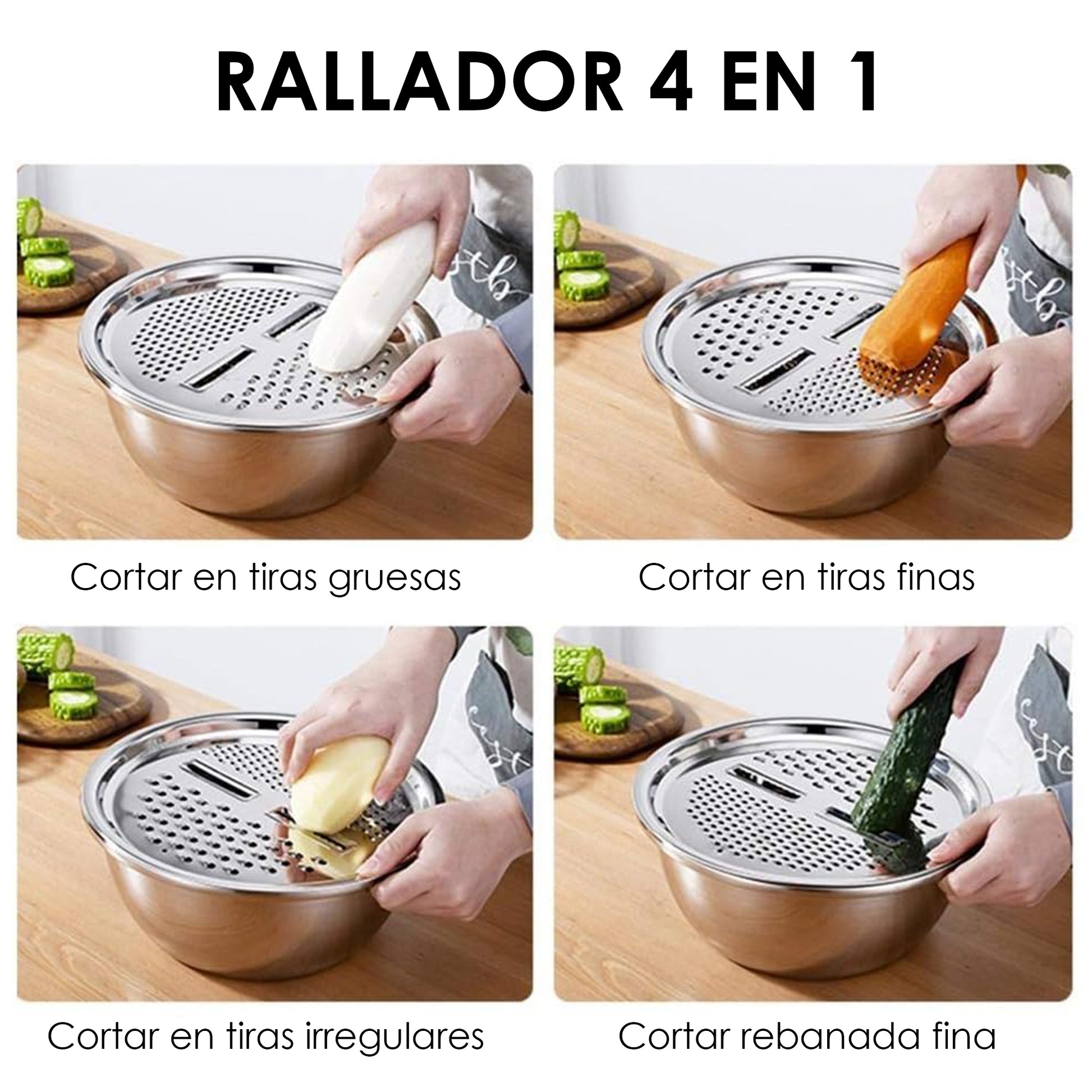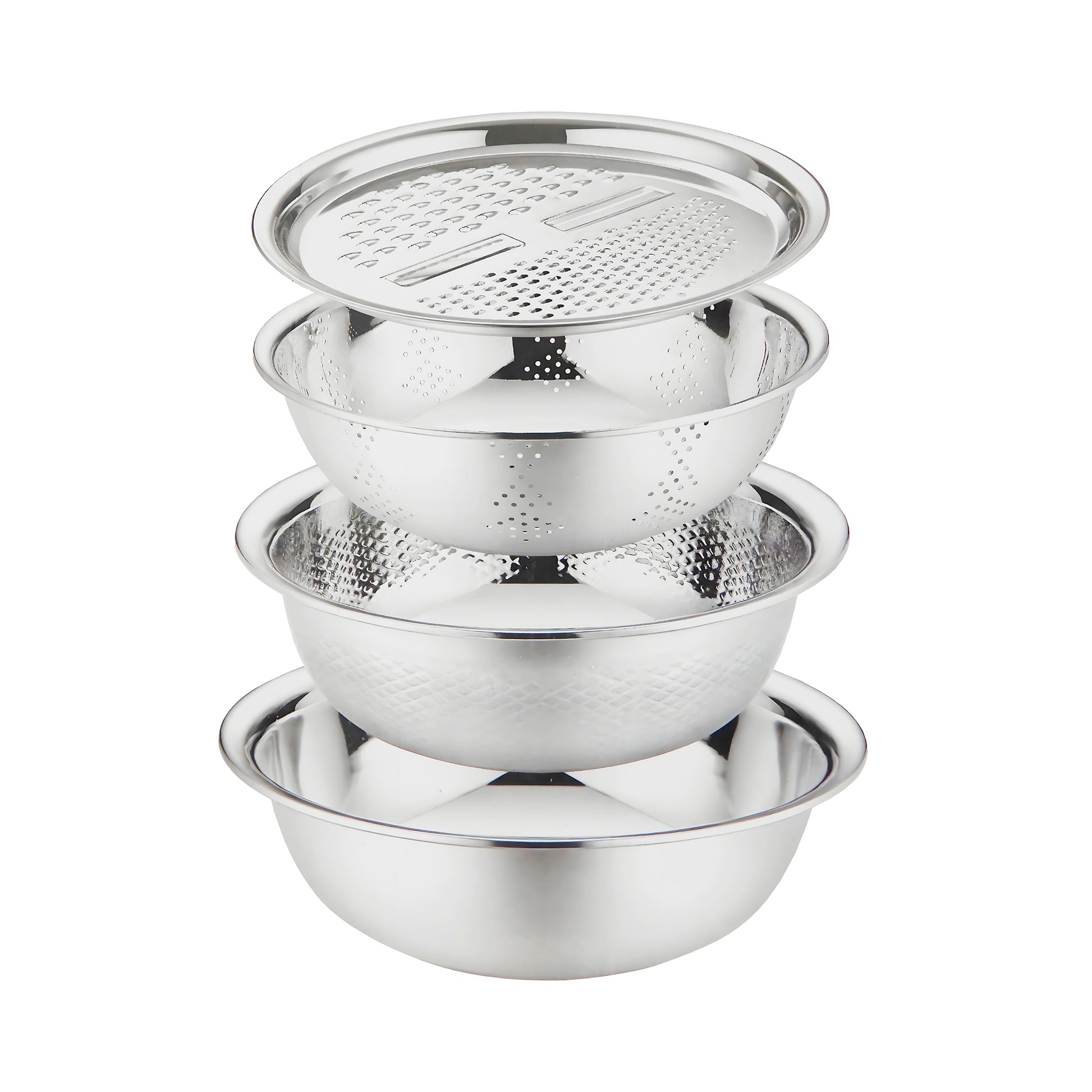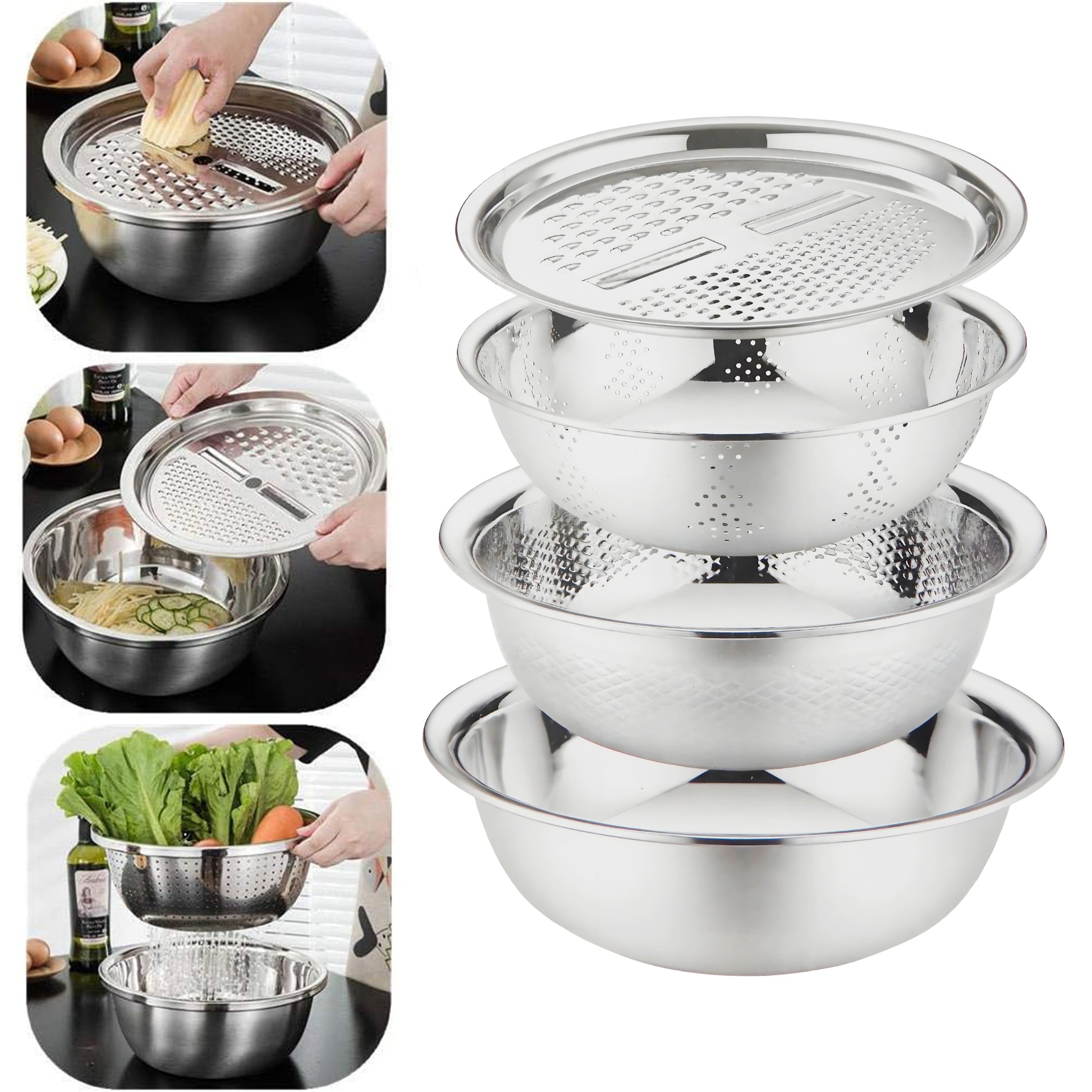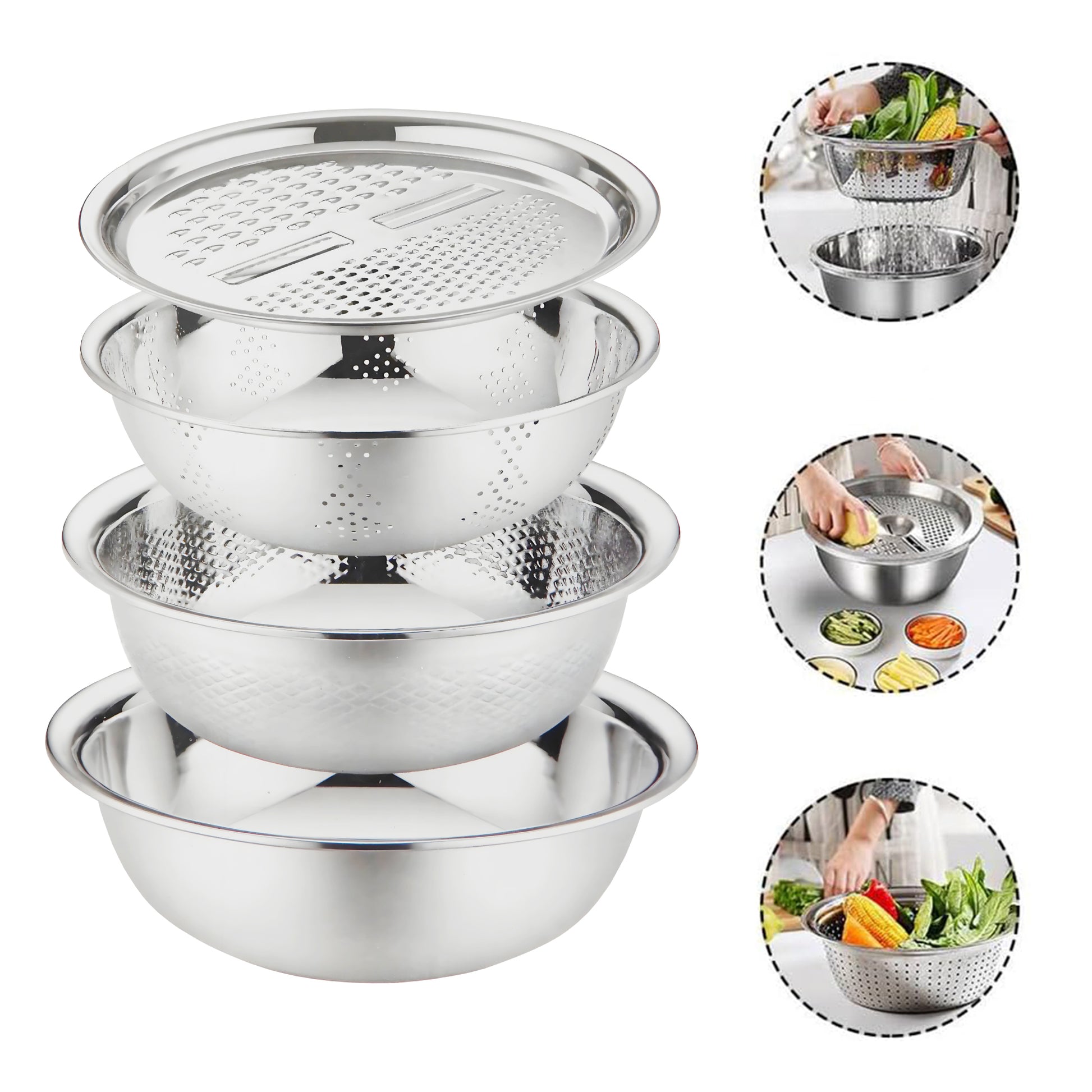 En este juego de ensaladeras encontraras un escurridor que te facilita la hora de limpiar o lavar algunos alimentos o para pastas, cuenta con un rallador que se puede hacer rodajas de papa o zanahoria usando el rallador en la parte superior. Diseño apilable, todas las piezas se pueden almacenar juntas para ahorrar más espacio en la encimera, los orificios de drenaje son densos y uniformes, el agua se puede filtrar de forma rápida y eficaz, son resistentes ya que son de Acero Inoxidable.